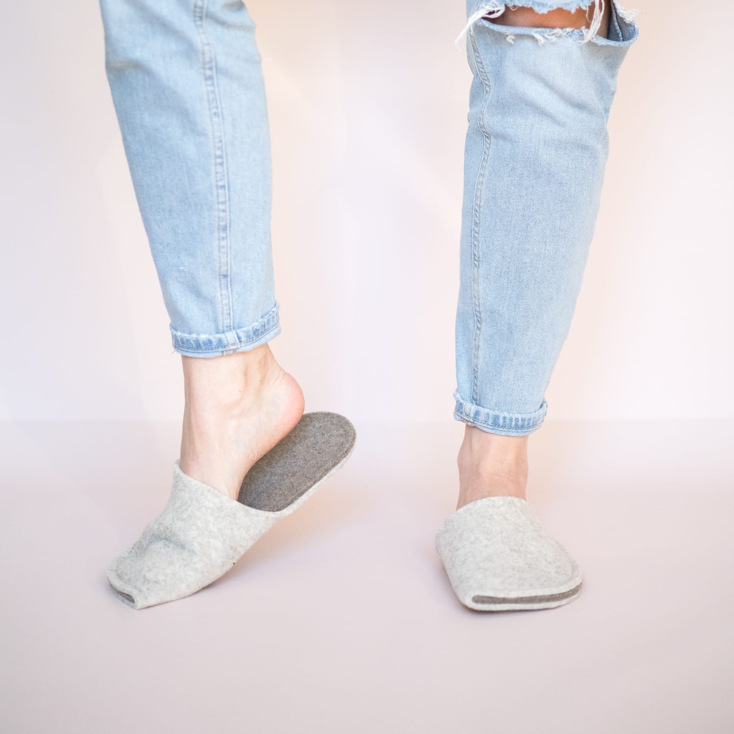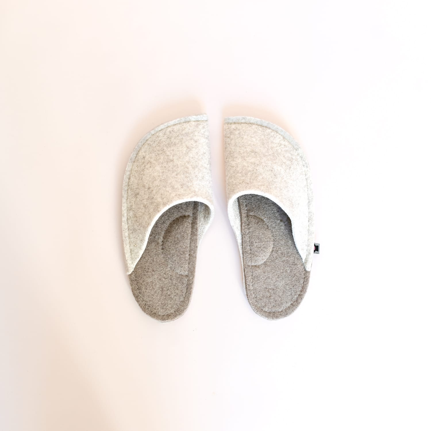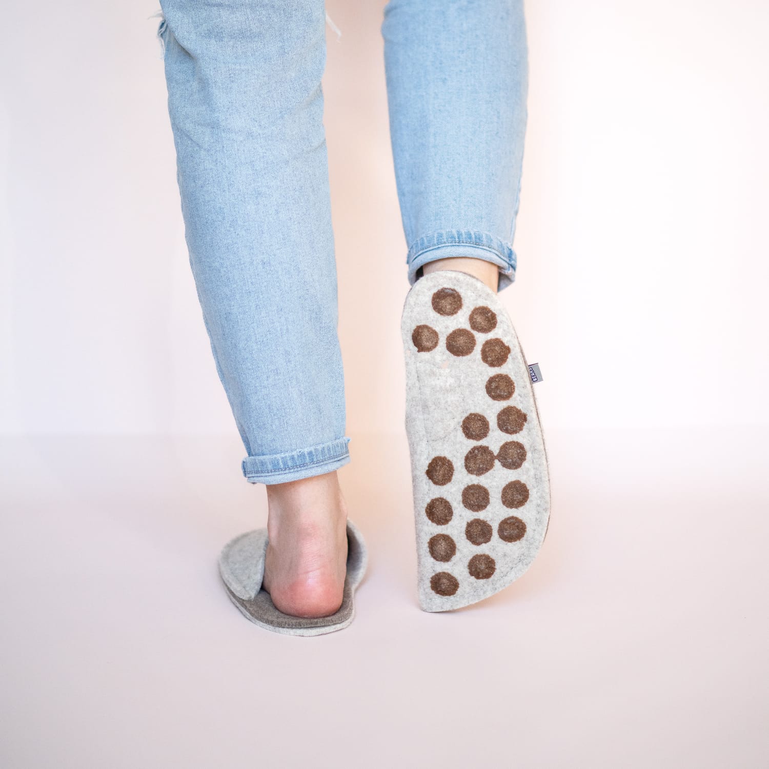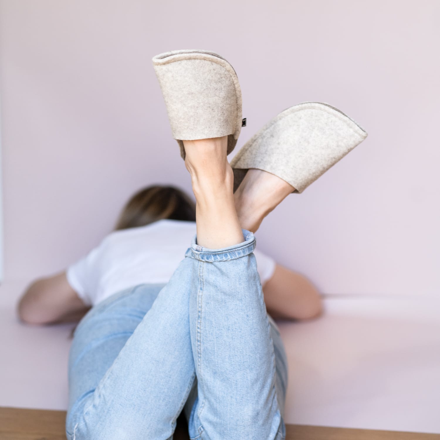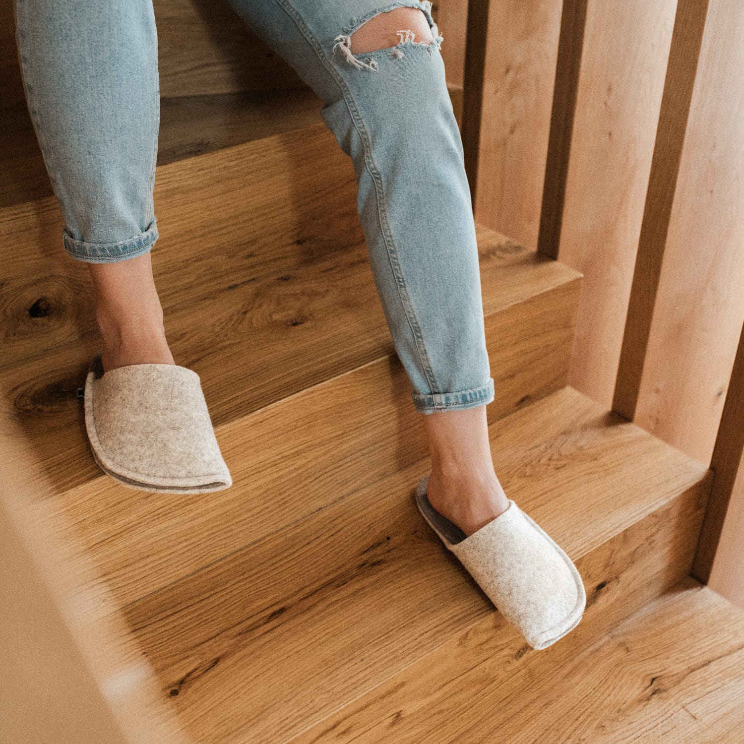 The slippers are made of wool felt, known for some of its fantastic features. Warmth, lightness, and breathability are just some of them. Additionally, the material is very skin-friendly, so you can wear the slippers on bare feet. Wool regulates body heat much better than other materials, so you’re more comfortable in a broader range of temperatures. Your feet will sweat less, and therefore (yes, you guessed right), your feet and slippers will smell less.